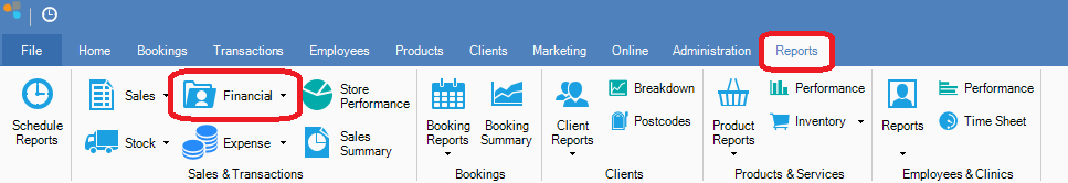 Step 1: Click the Reports tab and select Financial from the drop down menu.