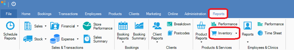 Step 1: Click on the Reports tab and select Inventory under Products & Services.