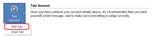 Step 5: Send an SMS test to ensure your SMS system is running. Do this by clicking Test Account and selecting SMS Test from the drop down menu.