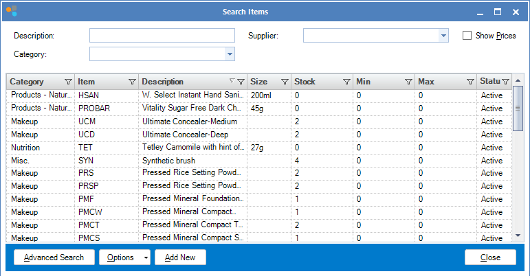 Step 2: The Search Items window will display. Double click on the product you wish to suspend.