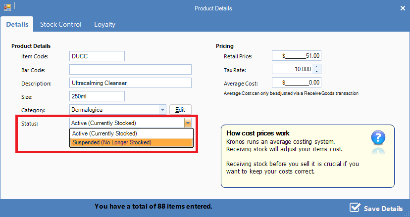 Step 3: The Item Maintenance window will display. Change the status field to Suspended (No Longer Stocked). Click Save Details to save your changes.