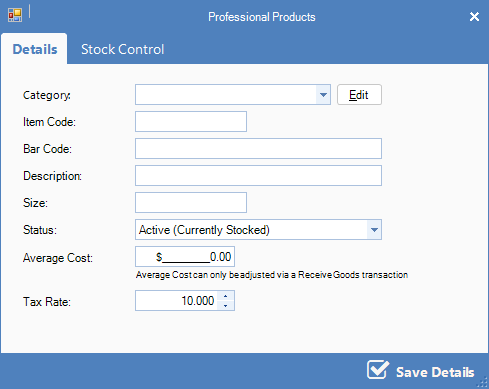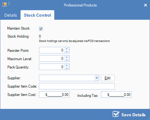 Step 3: The Stock Control will display. Fill in the fields and once done, click Save Details.
