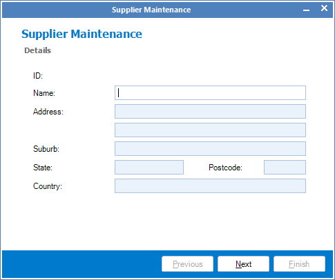 Step 2: The Supplier Maintenance screen will open. Follow the prompts and fill in all the information as thoroughly as possible and once done, click Finish to save your new supplier.