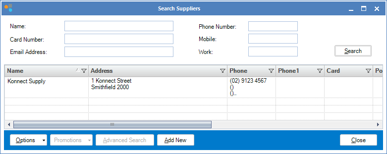 Step 2: The Search Supplier window will open. Use the fields to search for your supplier. To Edit a supplier, double click on their name.