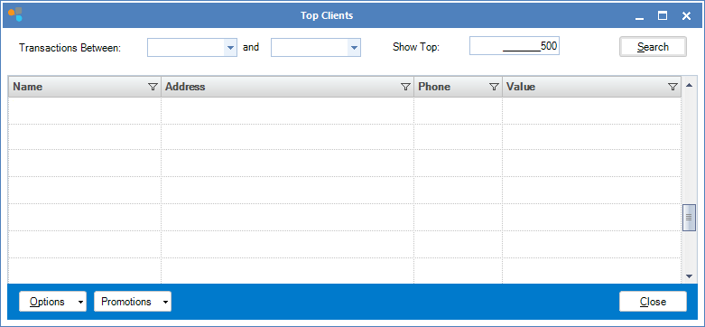 Step 2: The Top Clients window will open. You will be able to see clients and the amount they have spent in your store. You can also use the fields to find the top clients within a certain date period.