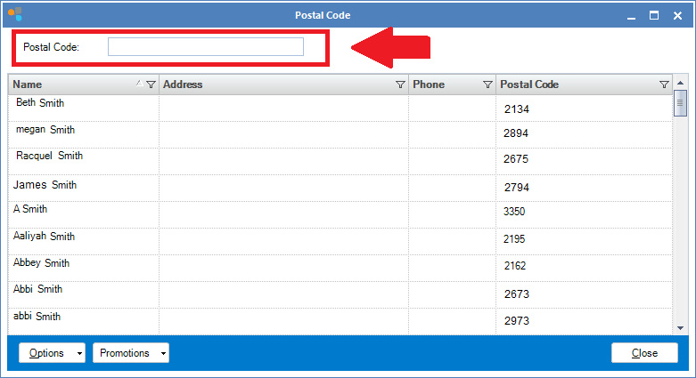 Step 2: The Postal Code window will open. Type in the postal code in the Postal Code field to display all clients with that post code (according to the details in the client card).