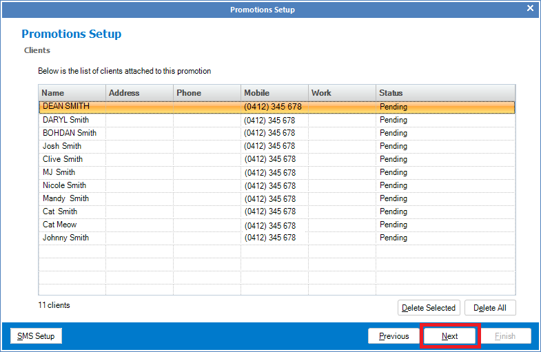 Step 4: This window will show you all the clients you have added to this promotion. You are able to select clients and delete them by clicking on the client's name then clicking on the Delete Selected button. Once you are sure, click Next.