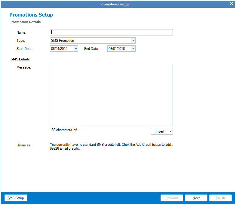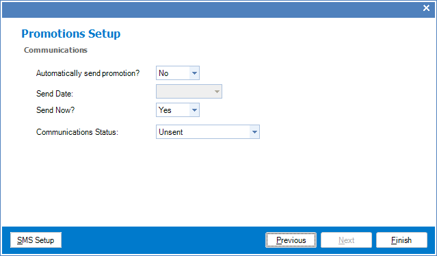 Step 2: The Promotions Setup window will open. Fill in the fields then click Next.