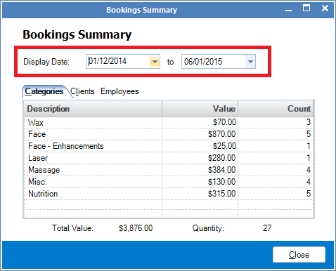 Step 5: The Employees tab will show you the amount of bookings each employee has taken during the selected dates, and the total value of the bookings.