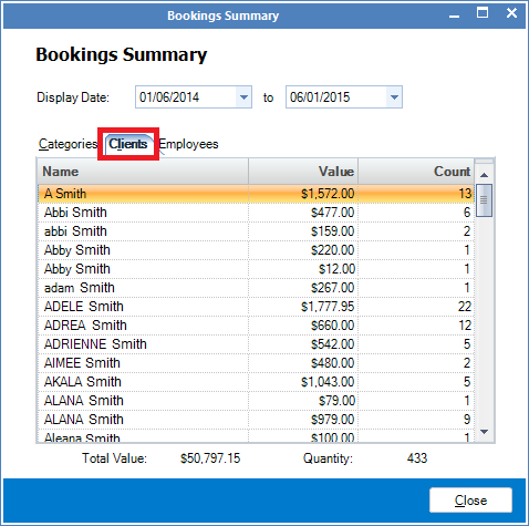 Step 4: The Clients tab will show you all clients who had bookings during the selected period and the value spent.