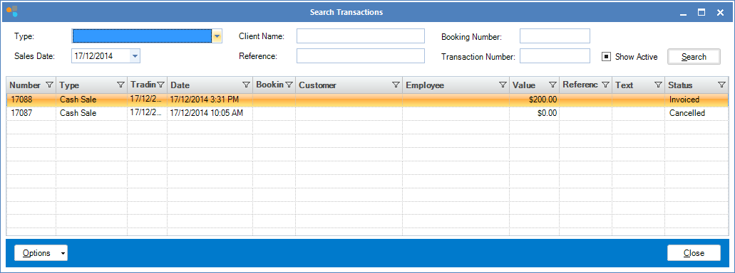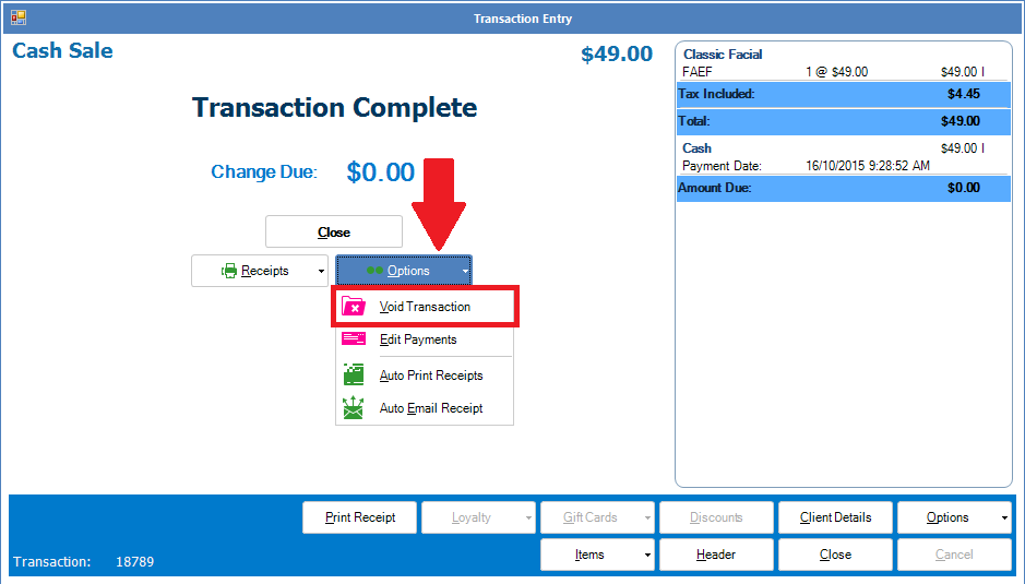 Step 3: When the transaction displays, click the Options button to show the Void Transaction tab.