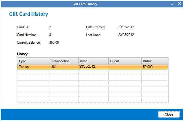 Step 3: The Gift Card History will appear.
