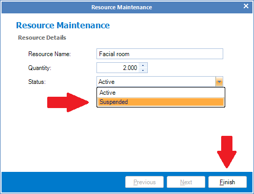 Step 4: If you no longer need to use the resource, change the status to Suspended and click Finish.