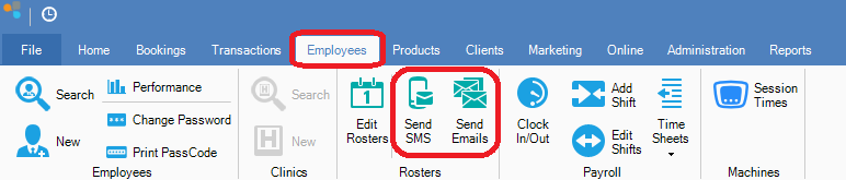 Step 1: Go to the Employees tab and select either Send SMS or Send Emails.