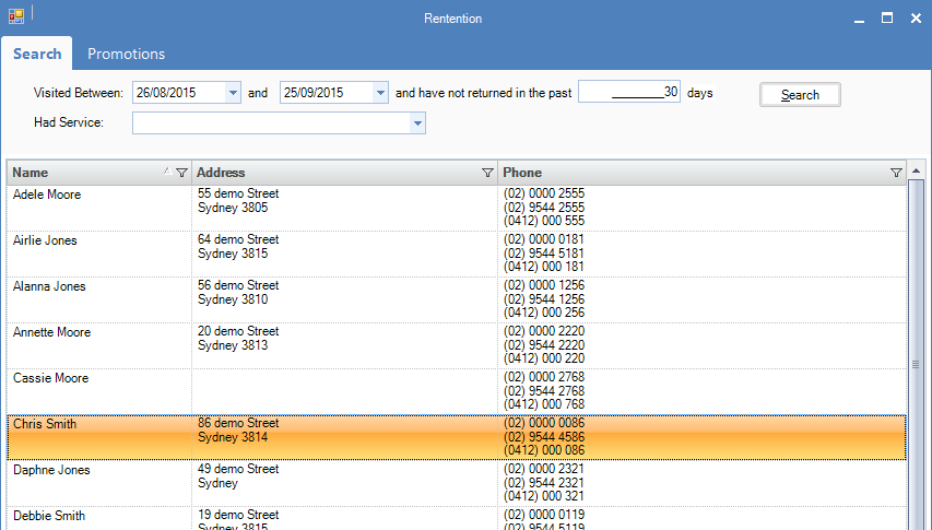 Step 2: The Retention window will display. Select the dates to limit your search by choosing dates in the Visited Between to view clients that have visited your business on and between the dates chosen. You can also enter the number of days in which the client has not returned in the Have not returned in the past box. You may also choose the type of service they had the last time they were at the business by choosing an option from the Had Service drop down menu to further limit your search.