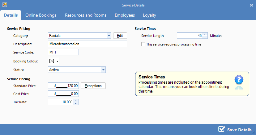Step 4: The Service Maintenance window will display. Edit any information then click the top tabs to amend other settings, then click Save Details to save your changes.