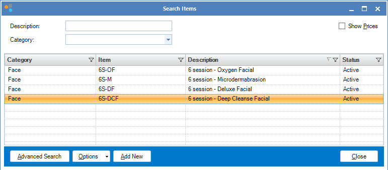 Step 2: The Search Items window will display. Search for the appropriate active prepaid package. To edit a prepaid package, double click on the package you wish to edit.