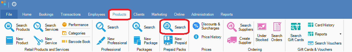 Step 1: Go to the Products tab and select Search under Prepaid Packs.