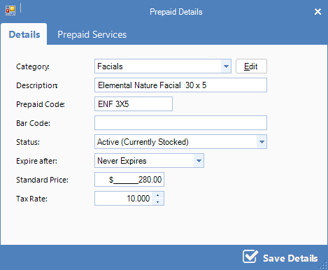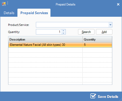 Step 4: You may remove a product or service by double-clicking on the item in the Prepaid Products and Services window. To add a new product, search for the appropriate product in the drop-down menu and click Add. Click Save Details to save your changes.