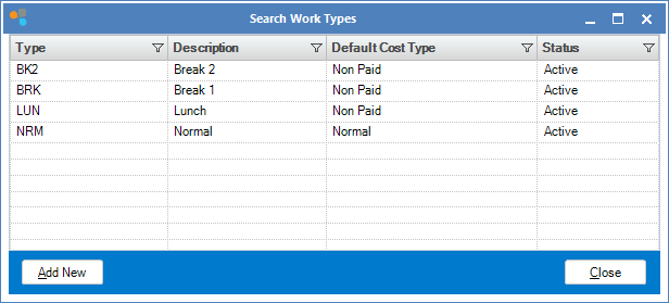 Step 2: The Search Work Types window will open. To Edit a work type double click on the work type you wish to edit. To Setup a new work type click the Add New button at the bottom left.