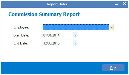 Step 2: The Commission Summary Report page will show. Select the employee name. starting and ending dates you would like to see in the report and click Run.