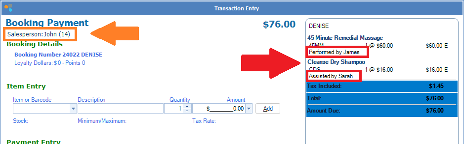 Do not get this report confused with the Salesperson report, which only takes into account whoever is named in the Salesperson field (orange), regardless of who served the client (red).