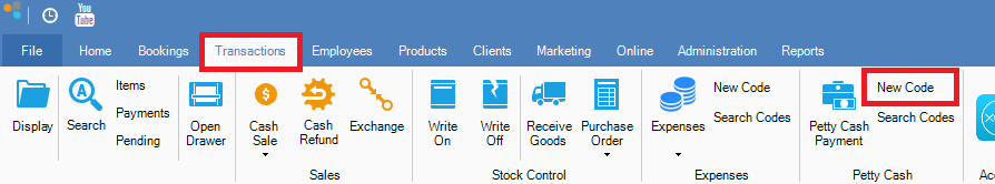 Step 1: Go to the Transactions tab and select New Code under Petty Cash.
