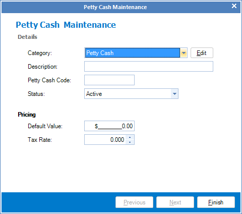 Step 2: The Petty Cash Code Maintenance screen will appear. Follow the prompts to setup your petty cash code.