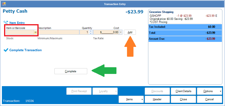 Step 2: The Petty Cash Transaction Entry will appear. Click on Item or Barcode (red square) to locate your petty cash code and adjust accordingly. Once done, click Add (orange arrow) and it will appear on the Transaction Entry. Select Complete (green arrow) to save the petty cash entry.