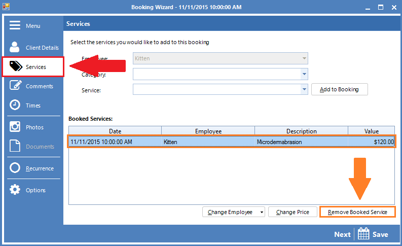 Step 2: The Booking Wizard will appear. To change the booked service, click on the Services tab (red arrow), highlight the Booked Services and select Remove Booked Service (orange arrow). Once removed, you can now choose a new service and select Add to Booking.