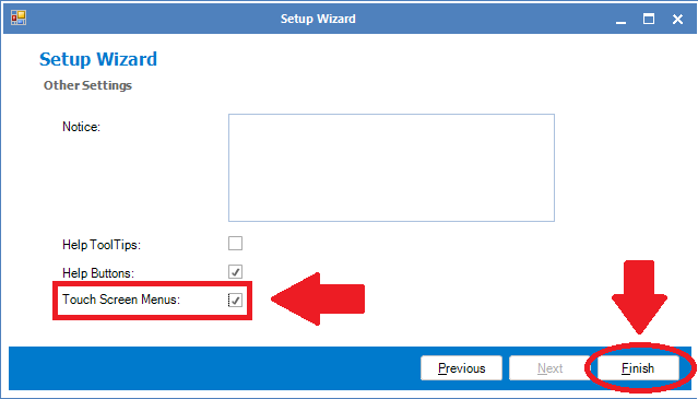 Step 2: You will see the Setup Wizard. Click Next until you reach the last page. To activate touch screen mode, ensure there is a tick and click Finish to save.