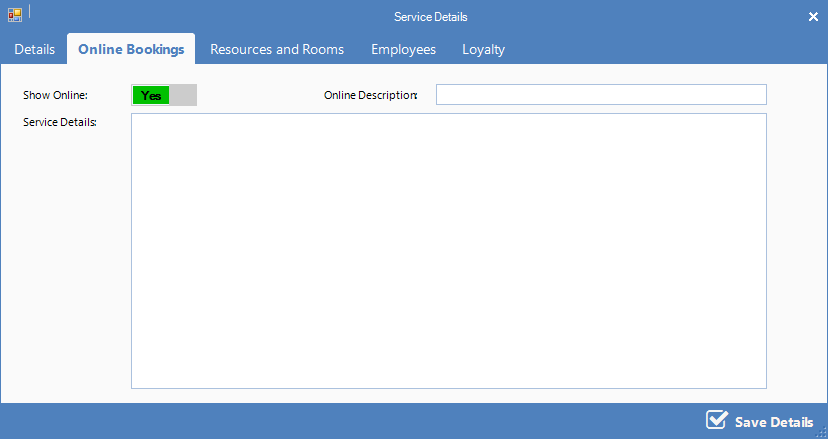 Show Online: If this service can be booked online (Yes) or can't be booked online (No).