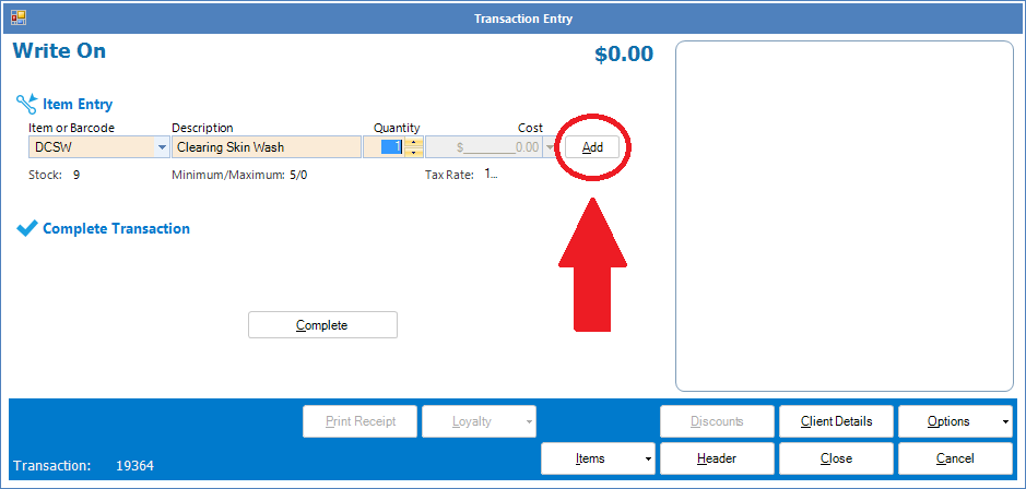 Step 2: The Write On Transaction Entry will appear. Select the item in question from the Item or Barcode drop down list, adjust the quantity as required and select Add.