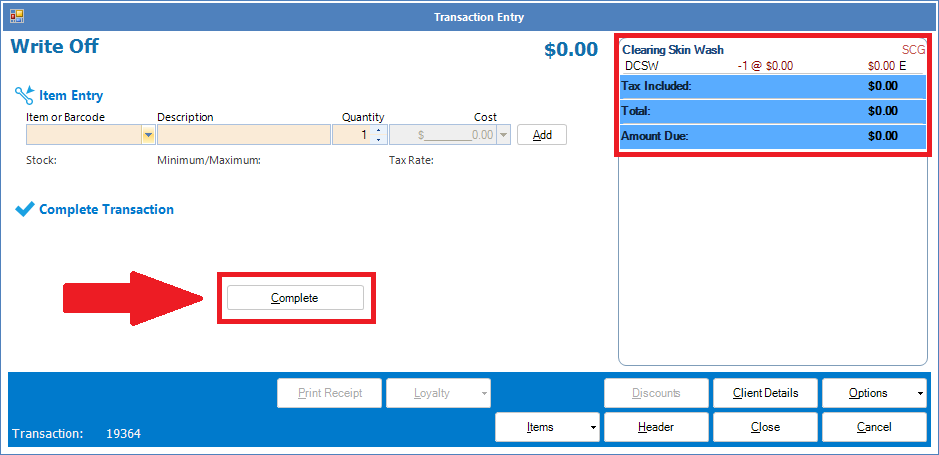 Step 4: The item will now appear on the right side. Continue performing Step 2 and 3 until you have completed your write off process. Once done, click Complete to finish.