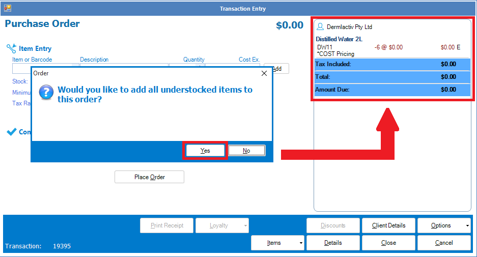 Step 3: A pop-up will appear asking if you would like to add all under-stocked items to this order. If Yes, the system will scan its database for any under-stocked items that is linked to the chosen supplier. If No, skip to step 4.