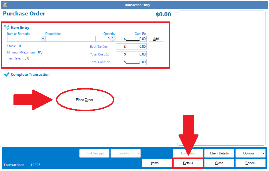 Step 4: Once you have selected No from the pop-up, select Details, This will bring up the Item Entry screen. Enter the items as required and once done, select Place Order to complete your purchase order.