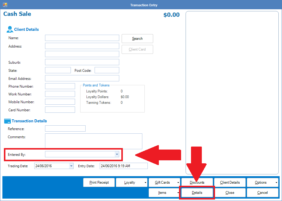 Step 2: In Client Details, select the employee's name from the Entered By drop down list. Click Details to return to the transaction screen.
