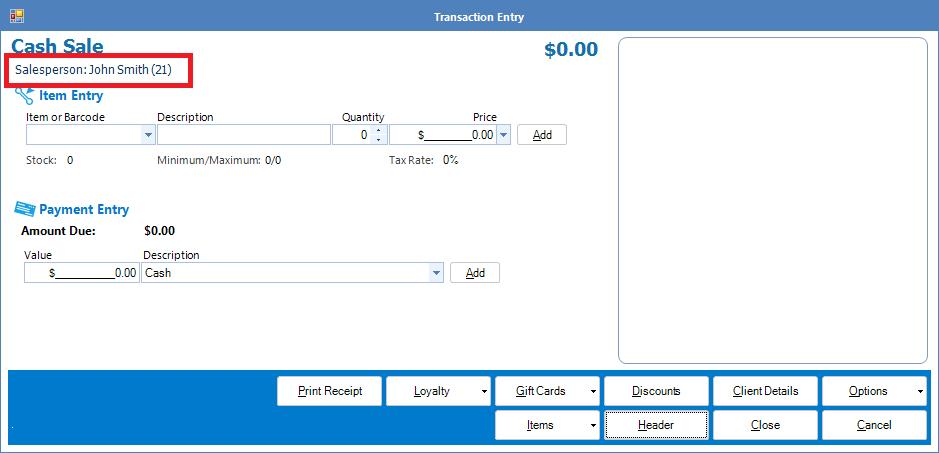 When performing a cash sale for walk in clients, you will need to manually set an employee's name to a transaction. This will ensure there is a record of who sold the item to the client and also adding the sales total to the employee's sales record.