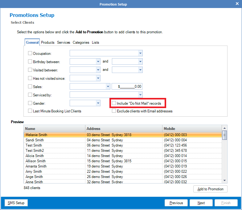 Note: When running a promotion, you may bypass the "Do Not Mail" criteria by ticking the "Include do not mail records". This will select clients even with 'do not mail' ticked in their client cards.
