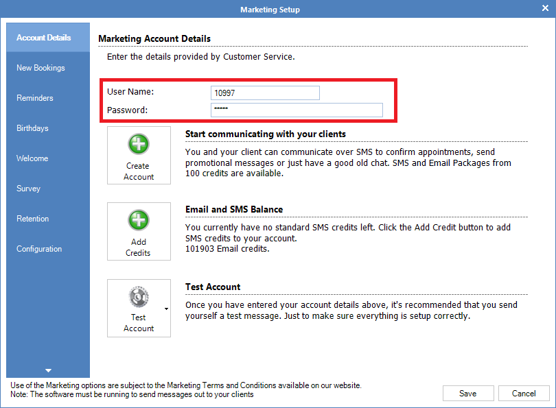 Step 2: Ensure your Username and Password is filled in. Once filled, you should be able to see your current email and SMS balance. If it is unavaliable, ensure your system is connected to the internet.