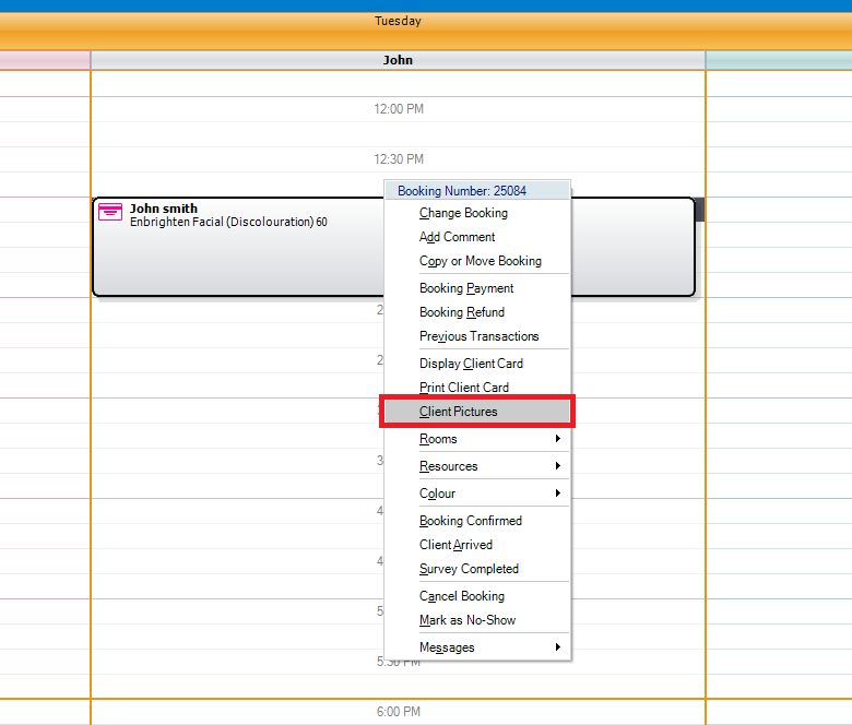 Step 1: Right click on your client's booking and select Client Pictures.