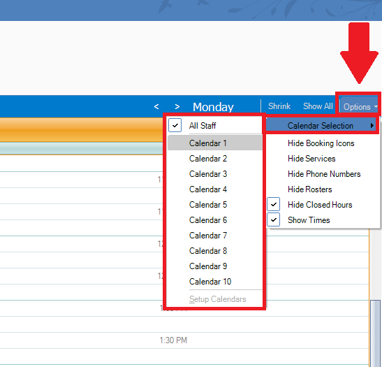 Step 4: Once the employee has been assigned a calendar number, go to the main calendar and select Options, followed by Calendar Selection. From there you may select the calendar number you assigned your employee. Once done, the calendar will show the selected employee's calendar view. You may repeat the same process for other employees by selecting a different calendar number.
