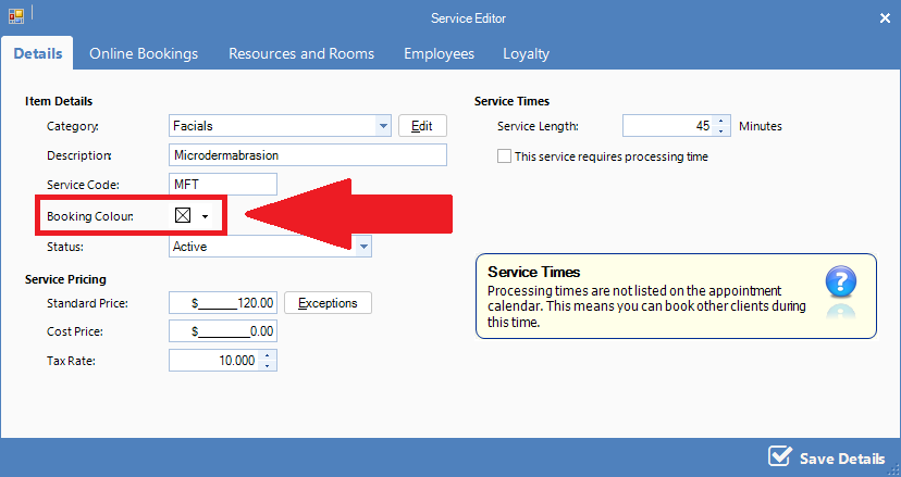 Step 3: The Service Editor will appear. Click on the Booking Colour option and assign a colour to your service. Once done, click Save Details. Whenever this service is selected, it will appear in your chosen colour on the calendar.