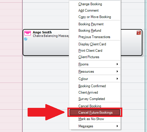 Step 2: Right click to reveal the options list and select Cancel Future Bookings. All subsequent future recurred bookings will be cancelled and removed from the calendar.